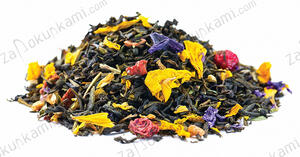 Китайский зелёный чай с бутонами жасмина, цветами мальвы, лепестками подсолнечника, кусочками клубники и красной смородиной. Купаж обладает цветочно-ягодным ароматом и сладковатым вкусом с ягодными нотами.