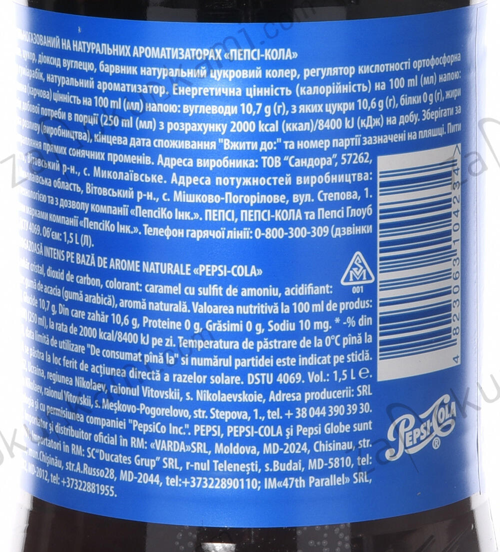 Напій Pepsi 1.5л Напій Pepsi 1.5лАртикул: p01-18928Штрих-код: 4823063104234Бренд: PepsiСтрана: УкраинаОбъем, л: 1.5Тип упаковки: ПЭТ28,00 ₴ +- шт Добавить в корзину